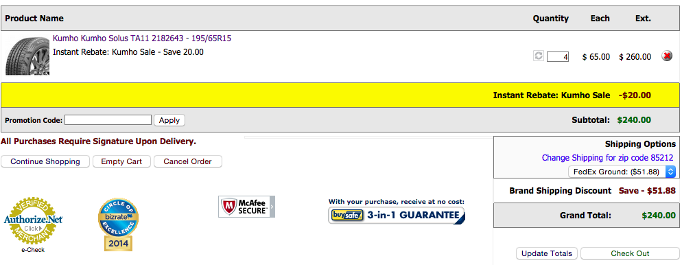 Right now you can pick up 4 Kumho Kumho Solus TA11 Tires for just $65 each — ADD FOUR to your cart and score a $20 Instant Discount making all 4 just $240.