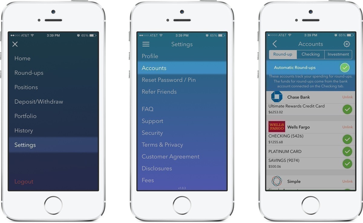 Register, then connect your checking accounts (and debit cards) — Acorn will automatically round up every purchase to the next dollar. It will then INVEST the difference in a portfolio of YOUR choice.