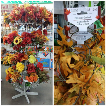 If you like to make your own wreaths the Dollar Tree has a great selection right now at my store in the front of the store, the great thing is that the Dollar Tree also carries the styrofoam wreaths that you need to make one.  I also found garland in the fall leave colors.