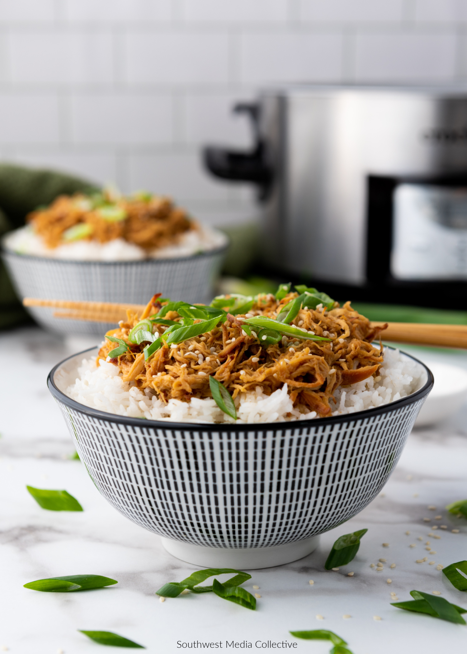 - Serve with rice and top with scallions and sesame seeds