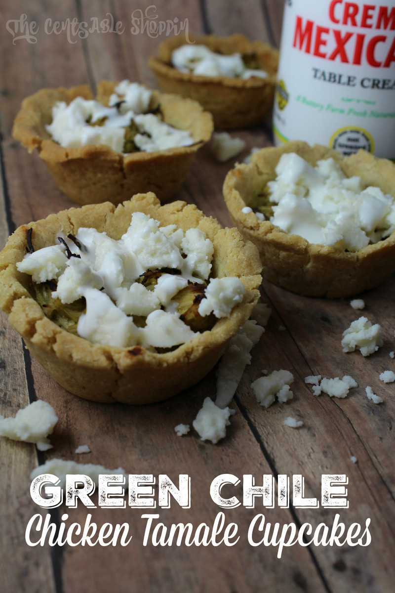 A wonderful Green Chile & Chicken Tamale Cupcake made with hatch green chiles and shredded chicken in a tamale-like cup, dressed with fresh cream and cheese.