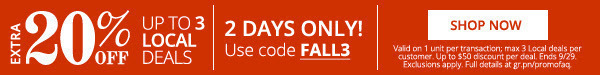RIght now on Groupon you can score 20% OFF 3 LOCAL DEALS with code FALL3. The offer is valid once per transaction, through 9/29 for a maximum of $50.