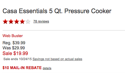 See the rebate by heading HERE — the pressure cooker is available for pick up in store (it may vary by area but IS available in mine!) The rebate is valid for purchases through today, 10/24.