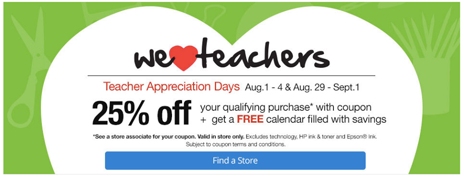 From 8/29 – 9/1, Office Max has Teacher Appreciation Days — teachers can get 25% OFF their qualifying purchase with coupon + a FREE Calendar filled with savings. Ask the store associate for your coupon – valid in store only.