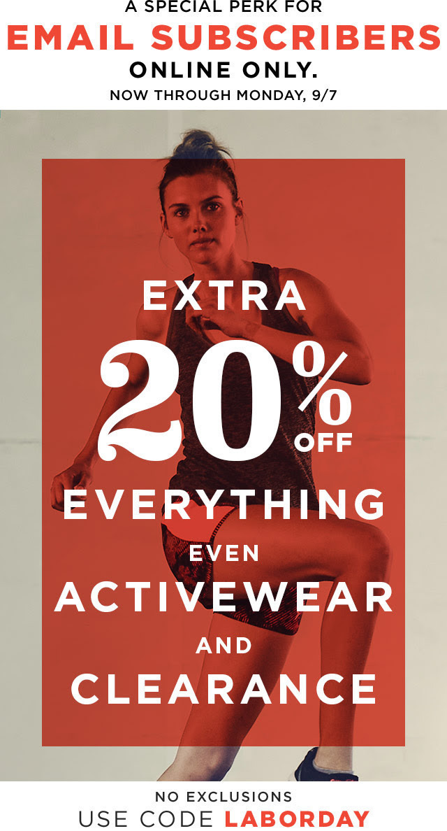 As mentioned earlier this morning, score 20% OFF ALL Activewear and Clearance online at Old Navy with code LABORDAY through 9/7.