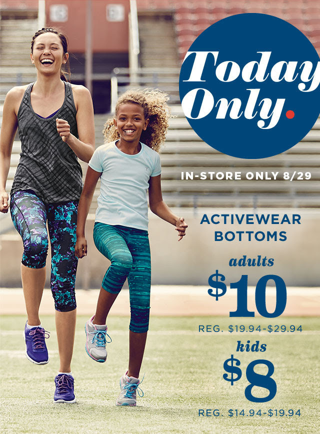 Today only (Saturday, August 29th)… and ONLY in store, score Activewear Bottoms at Old Navy for $10 (Adults) and $8 (Kids)… They are limited to 8 per customer in select styles only (while supplies last).