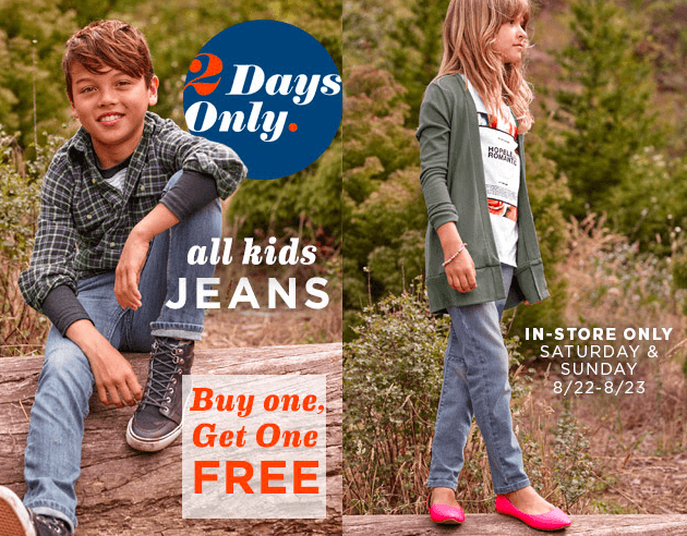 AND if you are taking the kids with you this weekend .. jeans for them are ALSO on sale – Buy 1 & get 1 FREE in store only, through Sunday.