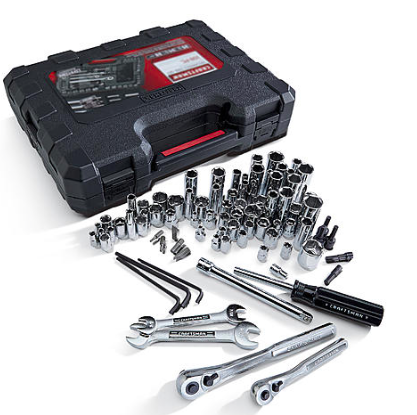 The high quality Craftsman 108-pc mechanics tools set includes an extensive collection of socket wrenches, nut drivers and accessories neatly packaged in their own case.