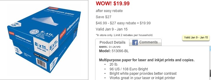 Don’t forget to use your Staples Rewards for 10% back on your Staples paper purchase (based on after-coupon redemption), making your total ZERO after coupon, rebate, and Rewards!