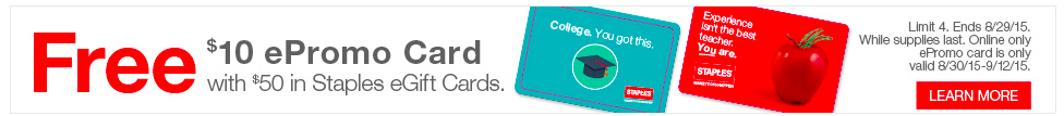 Right now at Staples, earn a $10 Staples Promo Card with a Staples Gift Card Purchase of $50 through 8/29. The Promo card is valid 8/30 – 9/12.