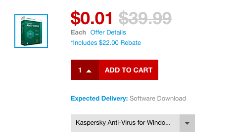 Right now on Staples.com, you can pick up Kaspersky Anti-Virus for Windows {1 User} for just $.01 – ONE penny!