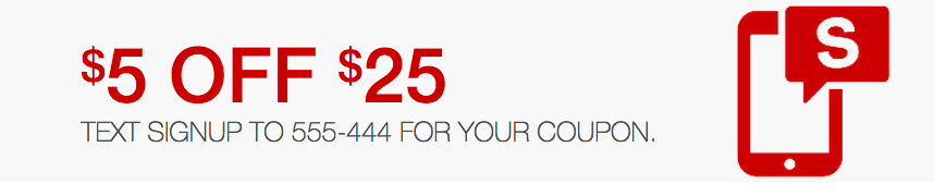 You can get a $5 off $25 mobile coupon by texting SIGNUP 555-444 for your coupon.