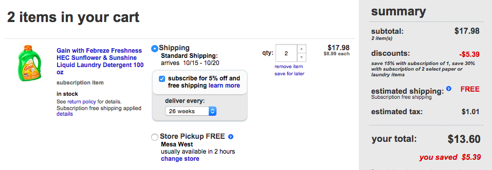 Target is offering 30% OFF your subscription order when you add (2) items to your shopping basket and subscribe – Gain Detergent in various scents is just $8.99.