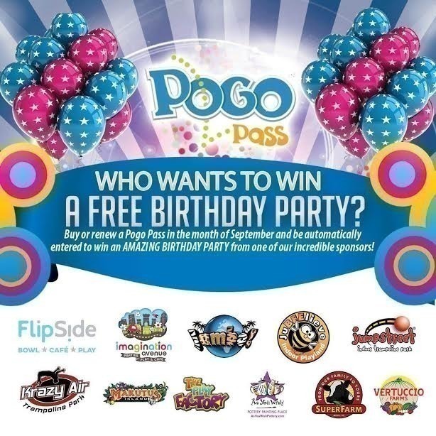 Buy or RENEW a POGO pass this month of September and be automatically entered to win an AMAZING birthday party from one of the incredible sponsors above!