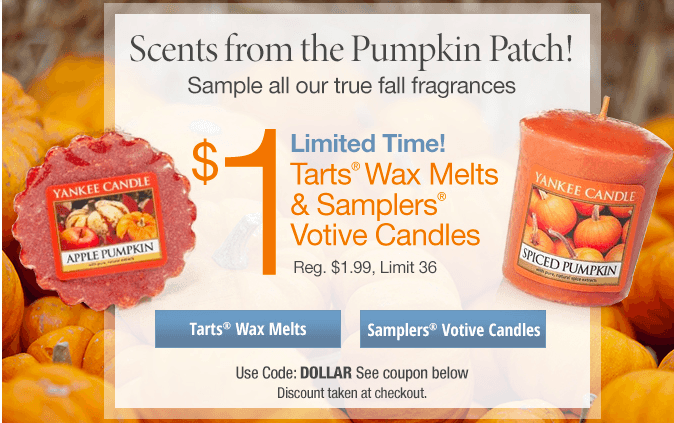 If you are a fan of Yankee Candle, pick up Tarts, Wax Melts, & Samplers Votive Candles for just $1.00 with coupon code DOLLAR or this printable coupon HERE.