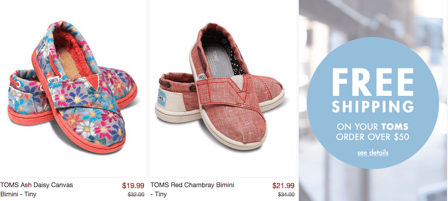 You’ll find Tom’s shoes at 40% off the regular price... with FREE shipping on $50 or more.